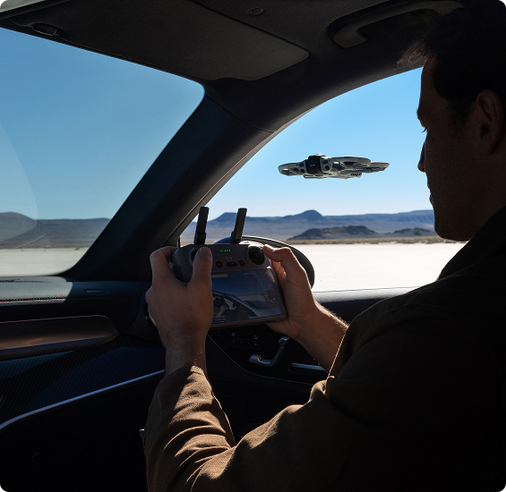 · Przy użyciu standardowego kontrolera również możesz latać i nagrywać w widoku First-Person View (FPV). Obraz przechyla się wraz z nachyleniem drona, nadając nagraniom dynamiczny, charakterystyczny styl FPV.
