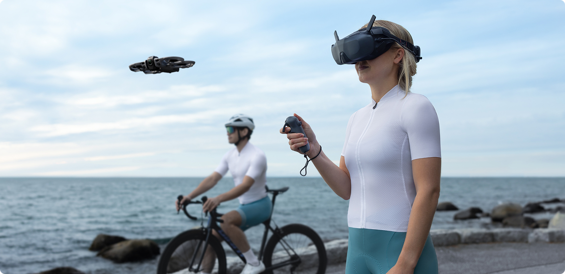 · Przy użyciu gogli i kontrolera ruchu możesz latać i nagrywać w widoku First-Person View (FPV), uzyskując lepszą jakość płaskiego obrazu wideo.